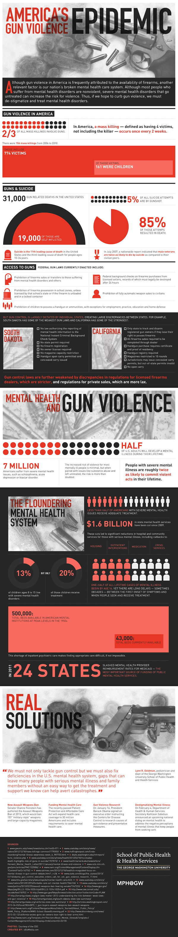The online Master of Public Health program (MPH@GW) in conjunction with SPHHS created an infographic in hopes of raising awareness around America’s broken mental health system and issues pertaining to gun control and violence in the United States.